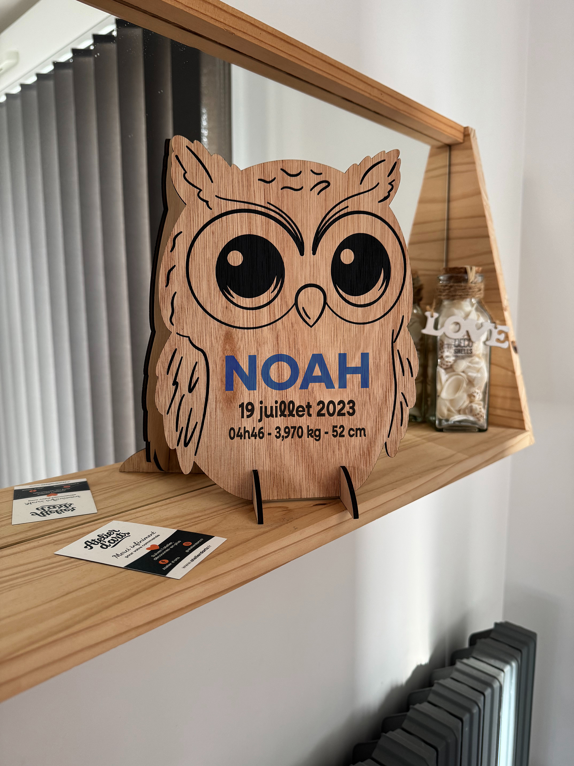 Ce hibou en bois de peuplier (27 × 20 cm) est personnalisé avec le prénom et les informations de naissance de votre bébé.
