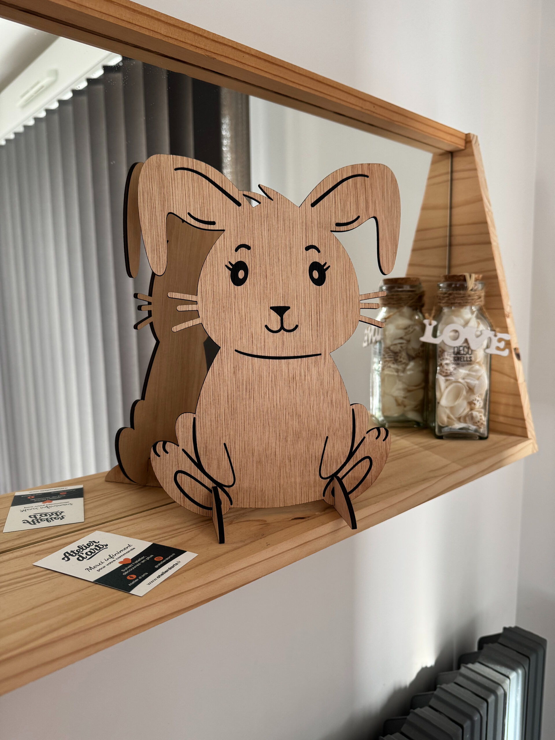 Fabriqué dans notre atelier vosgien, ce lapin en bois de peuplier est une création artisanale unique. Découpé et gravé au laser puis peint, il présente un style à la fois doux et moderne, avec des détails peints en noir pour faire ressortir son expression. Mesurant 27 cm de haut sur 19 cm de large, ce lapin se tient fièrement sur ses deux petits pieds en bois, également découpés au laser.