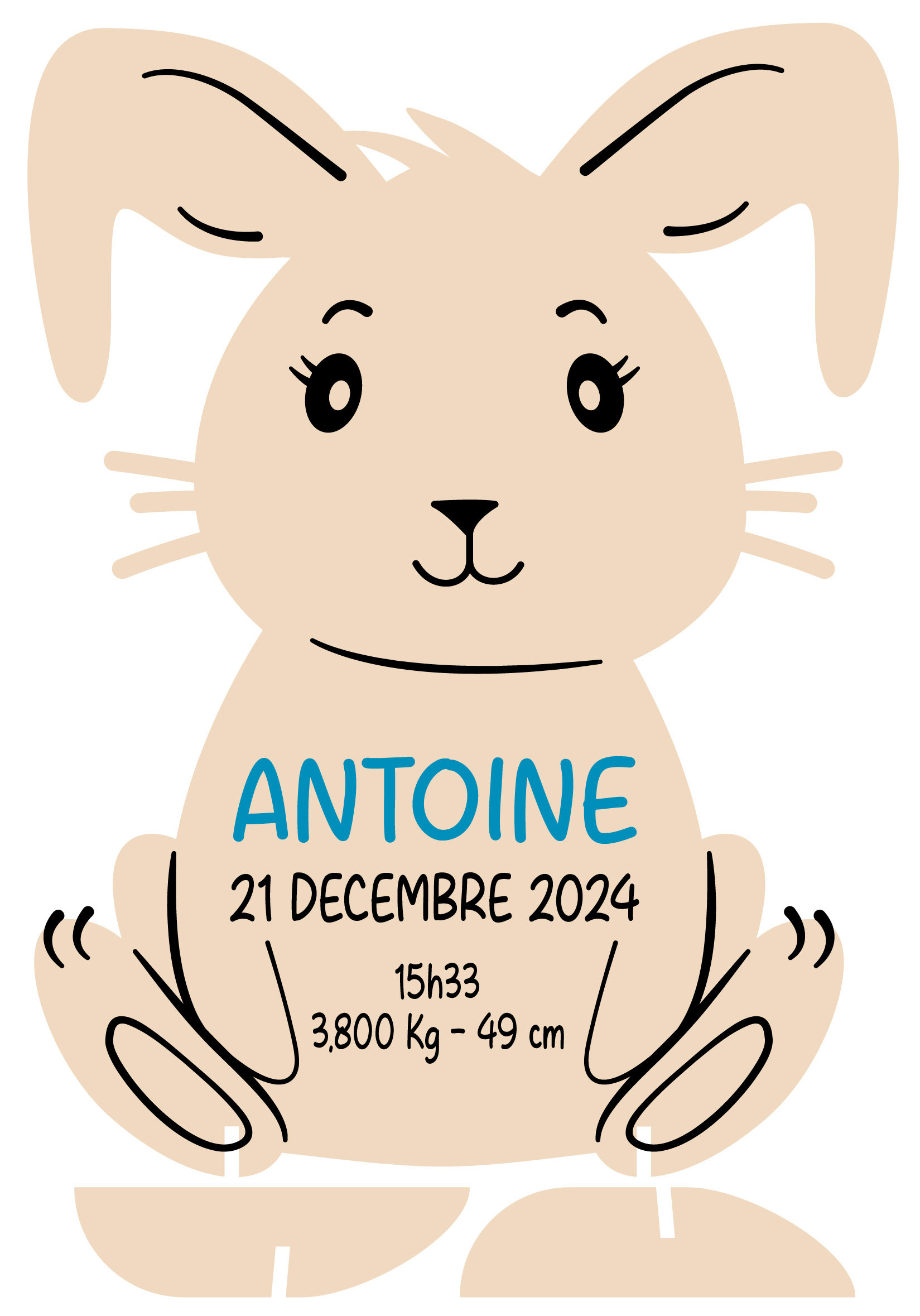 Ce lapin en bois de peuplier (27 × 19 cm) est personnalisé avec le prénom et les informations de naissance de votre bébé.